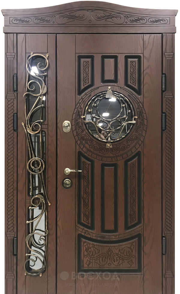 Металлическая основа с профилем 50х25 мм и стальным листом в 2 мм делает конструкцию прочной и долговечной, а ребра жесткости придают дополнительную устойчивость. Снаружи и внутри дверь оформлена панелями из натурального дерева, благодаря чему выглядит не только надежно, но и по-настоящему представительно. Красивая входная дверь в коттедж №2 сочетает в себе солидность металлической защиты и уют теплых древесных оттенков, что особенно ценят владельцы загородных домов. Два контура уплотнения защищают помещение от сквозняков, а при желании можно добавить тепло- и шумоизоляцию. За безопасность отвечают два замка турецкого производства Kale Kilit, сувальдный и цилиндровый, каждый с системой из трех ригелей. При необходимости замки можно заменить на модели премиального уровня или даже электронные варианты, а дополнительно установить зеркало, стеклопакет или кованые элементы. Эта дверь уверенно сочетает функциональность, престиж и возможность индивидуальной доработки.