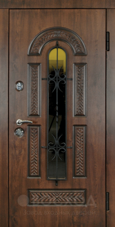 Эта металлическая дверь станет надежным выбором для вашего частного дома или коттеджа. Изготовленная с учетом всех современных требований безопасности и комфорта, она включает терморазрыв в коробке и полотне, что эффективно защищает от холода и влаги. Внешняя и внутренняя отделка выполнены из массива дерева, придавая двери элегантный вид, стойкость к механическим повреждениям и долговечность. Особое внимание стоит уделить элементам ковки, которые подчеркивают уникальность дизайна. Прочные замки с тремя ригелями (сувальдный и цилиндровый) обеспечивают высокий уровень безопасности. Конструкция из оцинкованной стали с усиленными ребрами жесткости и многослойной тепло- и шумоизоляцией гарантирует долговечность и защиту от внешних факторов. Дополнительно возможно комбинировать отделку, установить стеклопакет или зеркало, а также подобрать замки по индивидуальному запросу.