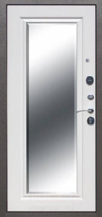 Белоснежная внутренняя панель придаёт двери свежий и современный облик, а зеркальная вставка делает прихожую светлее и визуально просторнее. Дверь лабиринт с шумоизоляцией (белая панель внутри) сочетает надежность металла и комфорт повседневного использования. Стальной каркас из профильной трубы с листом толщиной 2 мм и рёбрами жёсткости обеспечивает прочность конструкции, а два контура резинового уплотнителя помогают защитить помещение от сквозняков и пыли. Панели МДФ с ПВХ-покрытием не боятся царапин и сохраняют аккуратный вид даже при активной эксплуатации. Для защиты используются два замка — сувальдный Просам и цилиндровый Мосрентген, каждый с тремя ригелями. Дополнительно дверь можно оснастить плитой минваты или пенопластом для повышения шумо- и теплоизоляции, а также индивидуально подобрать декор, включая кованые элементы или стеклопакет. Такой вариант удачно смотрится как в квартире, так и в доме или офисе.