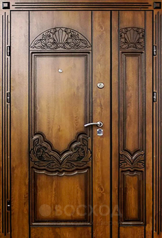 Дверь входная в частный дом двойная №100 – выбор для тех, кто ценит масштаб и выразительность фасада. Две створки позволяют не только подчеркнуть статусность коттеджа, но и обеспечивают удобство при заносе крупной мебели или техники. Основа конструкции выполнена из профильной трубы и листа стали толщиной 2 мм, что придаёт жёсткость и долговечность. Внешняя и внутренняя отделка массивом дуба создаёт ощущение солидности, а заодно защищает поверхность от случайных царапин и деформаций. Дуб сохраняет привлекательный вид десятилетиями, не боится перепадов температуры и влаги, поэтому такая дверь уместна именно в загородном доме. Двойной контур уплотнителей обеспечивает базовую защиту от сквозняков, а при необходимости дверь можно дооснастить утеплителем. Это решение объединяет эстетику парадного входа и надежность металлической конструкции, превращая входную группу в настоящее архитектурное украшение.