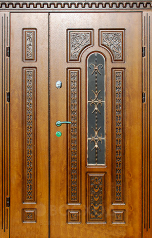 Деревянная панель в отделке всегда придаёт входной группе респектабельность, а в сочетании с прочным металлическим каркасом превращается в надёжный щит для дома. Натуральное дерево устойчиво к случайным ударам, сохраняет форму и привлекательный вид даже при перепадах влажности и температуры, а его фактура подчёркивает статусность фасада. В основе конструкции – сталь толщиной 2 мм и профильная труба, усиленная рёбрами жёсткости, что обеспечивает долговечность и сопротивляемость взлому. Двупольная входная дверь для загородного дома №105 смотрится особенно выигрышно за счёт двух створок: это удобно при приёме гостей, внесении мебели и просто создаёт ощущение простора. Два контура уплотнителей защищают от сквозняков, а при желании дверь можно утеплить минватой или пенопластом. Такое решение совмещает эстетику натурального дерева и мощь металла, делая вход в коттедж не только надёжным, но и по-настоящему представительным.