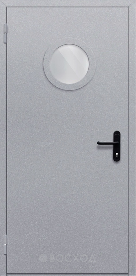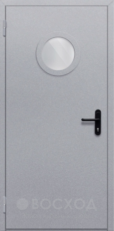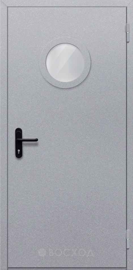 Дверь однопольная с круглым стеклом №13 сочетает в себе строгость металлической конструкции и изящный декоративный элемент, который сразу выделяет её среди типичных технических моделей. Круглое стекло не только добавляет визуальной легкости, но и обеспечивает дополнительный контроль пространства за дверью, что особенно важно для производственных или складских помещений. Основа выполнена из холоднокатаной стали толщиной 1,5 мм, усилена профильными трубами и противосъёмными штырями, благодаря чему дверь сохраняет жёсткость и устойчивость к взлому. В отделке используется нитроэмаль, которая выдерживает перепады температур и устойчива к износу, сохраняя поверхность аккуратной даже при интенсивной эксплуатации. Внутреннее заполнение из базальтовой плиты повышает звуко- и теплоизоляцию, а два контура уплотнения вместе с термоактивной лентой надежно защищают от проникновения дыма. Эта модель объединяет практичность, долговечность и заметный дизайнерский акцент.